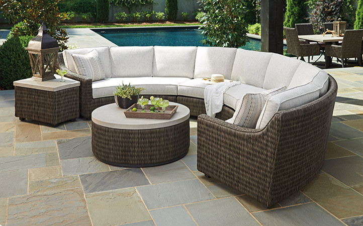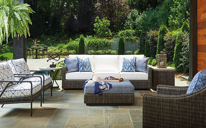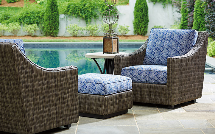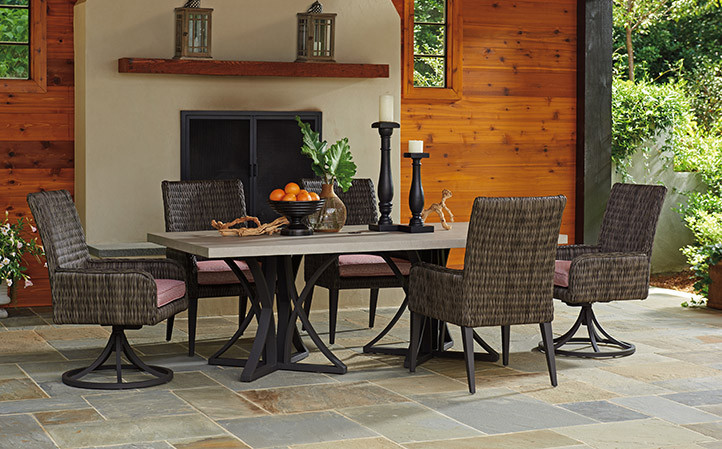 Cypress Point Ocean Terrace features a distinctive V-pattern of all-weather woven wicker, aluminum frames in a custom aged iron finish and contemporary Weatherstone tops that emulate honed limestone.