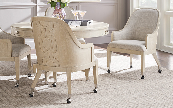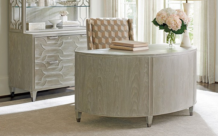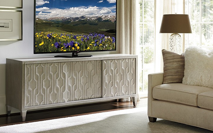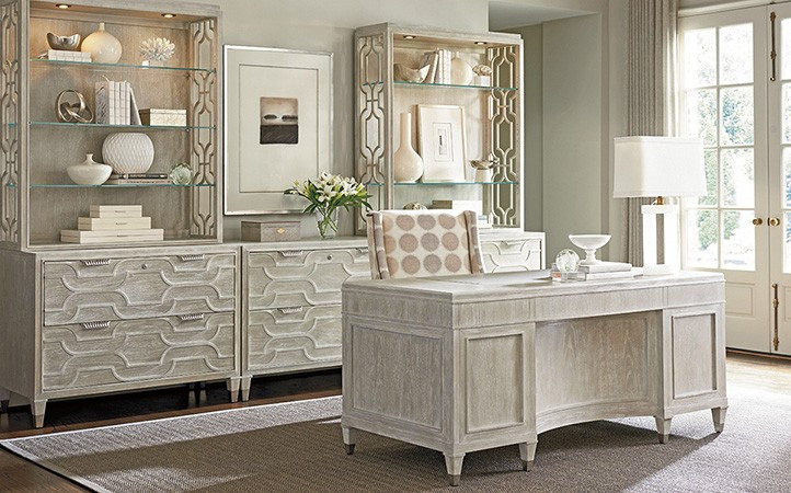 Crafted from select walnut veneers, Greystone designs reflect a sophisticated tone. It's surfaces are wire brushed by hand to accentuate grain characteristics and then finished in a soft pearl gray coloration with a white glaze that adds visual interest. The collection's signature design elements are the contemporary fretwork pattern showcased on the file chest, deck and media console, and custom hardware in a striking brushed nickel finish. The look is remarkable, offering a fresh contemporary aesthetic to one of the most important rooms in the home.
