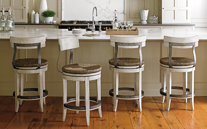 Designs feature an eclectic mix of traditional elements like button-tufting, breakfront profiles and turned legs with more transitional features like geometric metal bases, burnished stainless steel tops and natural materials.