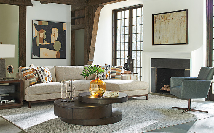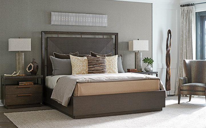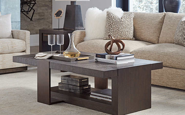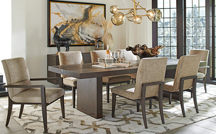 Highlighted by the elegant grain patterns of quartered white oak, designs in Park City boast clean architectural lines in a rich dark mocha finish. Custom hardware and metal accents framing the bases on many items are finished in burnished bronze. Signature items incorporate faux horn, authentic hair-on-hide leather, Alpine marble tops and ultra-clear glass. Upholstery silhouettes reinforce the modern look with clean lines and meticulous tailoring using supple leather, textural fabrics, and neutral palettes. The interpretation offers a warm, elegant, and inviting look that defines luxury mountain living.