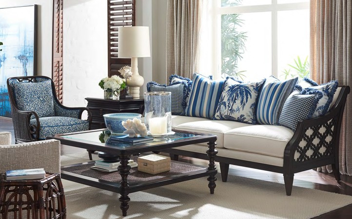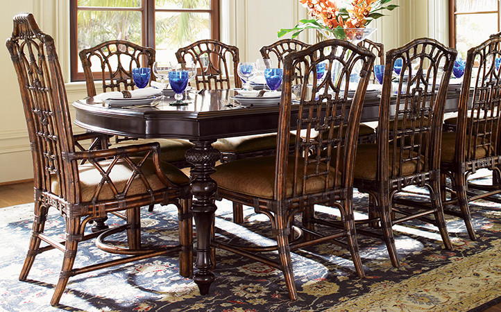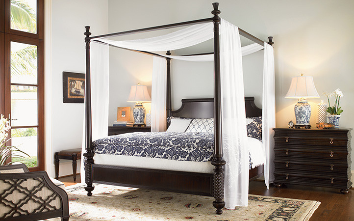 Designs are crafted from Ribbon Stripe and Quartered Mahogany veneers in an elegant dark Kona finish. Custom hardware, with exquisite detailing, is finished in bronze with a soft aged patina. Upholstered seating features hand-carved frames and dramatic fabric correlations.